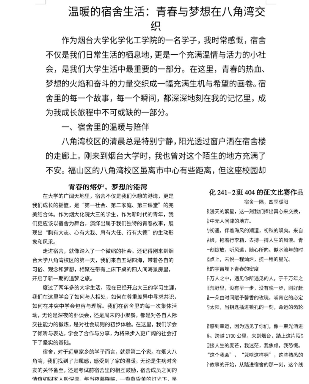 从公寓设计的奇思妙想到宿舍故事的温情传递,从笔墨生香的征文创作到实用满满的生活妙招,全院学子以宿舍为单位,用创意、文字、镜头与行动,勾勒出青春最美的模样,让“第二家园”焕发别样光彩。