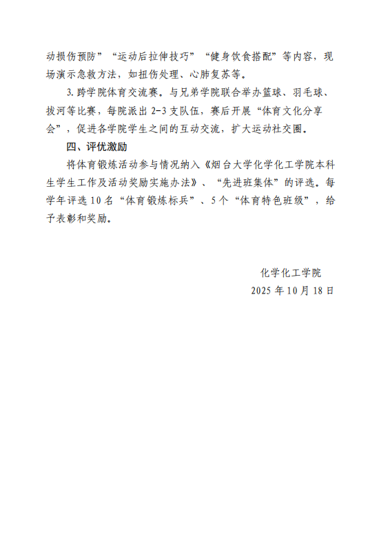 本科生学生工作及活动奖励实施办法》,并融入“先进班集体”评选核心指标体系。每学年专项评选10名“体育锻炼标兵”、5个“体育特色班级”,予以隆重表彰奖励,从制度层面充分调动学生个体与班级集体的参与热情,为体育育人工作扎实推进筑牢机制保障。