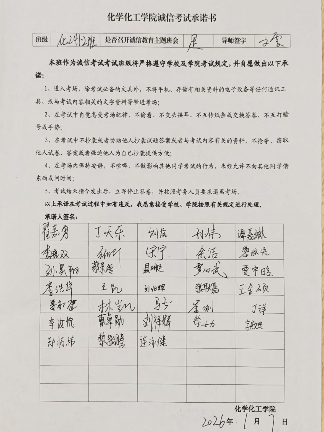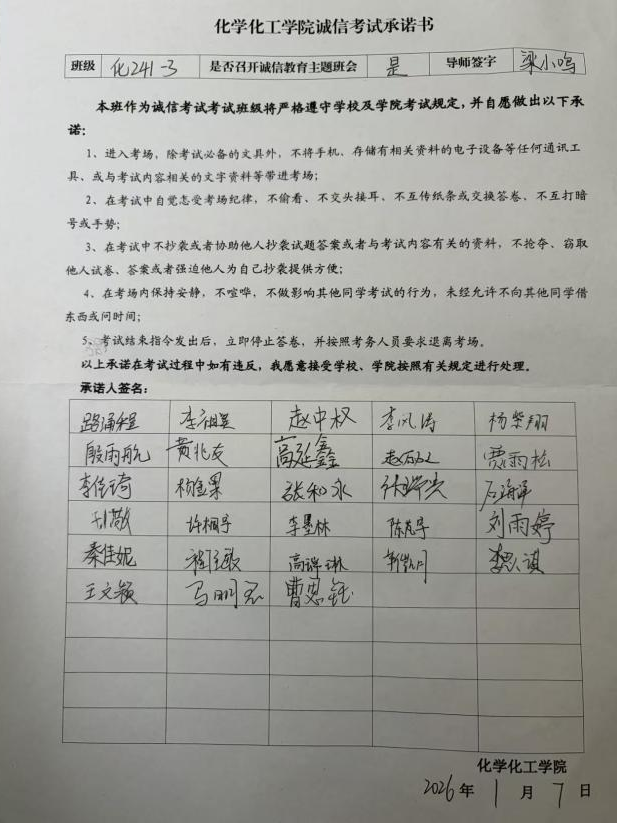 学生管理规定》等制度文件,结合学校历年典型违纪案例,深刻剖析作弊行为对个人学业档案、未来职业发展的深远负面影响,帮助学生清晰认清纪律红线、筑牢思想防线。同时,针对不同学业层次学生的学习特点与备考难点,精准提供个性化复习建议与规划指导,有效缓解学生备考压力、增强备考信心。班会尾声,全体同学在诚信考试承诺书上郑重签名,以庄重承诺践行诚信应考理念,推动诚信意识真正入脑入心、见行见效。