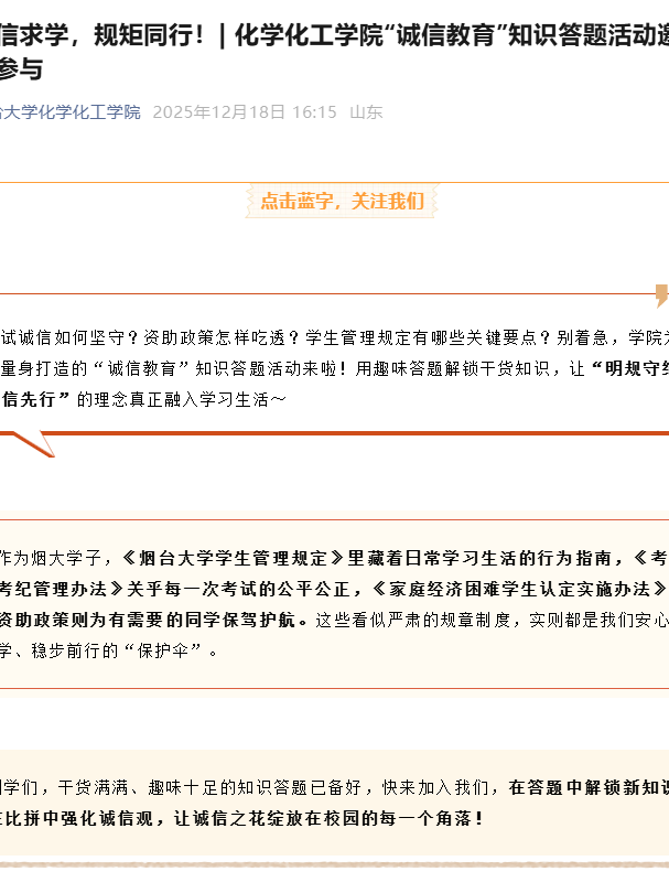 为提升诚信教育的趣味性与实效性,黄色动漫丰富教育载体,构建“线上竞赛+线下班会”双线教育模式。2025年12月底,黄色动漫同步推进线上竞赛与线下班会筹备工作,精心举办“明规守纪,诚信先行”线上诚信知识竞赛,依托线上小程序开展答题活动。竞赛题库全面涵盖考试纪律、作弊处分、学术诚信等核心内容,创新设置限时答题、实时排名等互动环节,让学生在竞技比拼中深化对诚信规范的理解;同时明确各班级需以主题班会为载体,专题学习《黄色动漫
